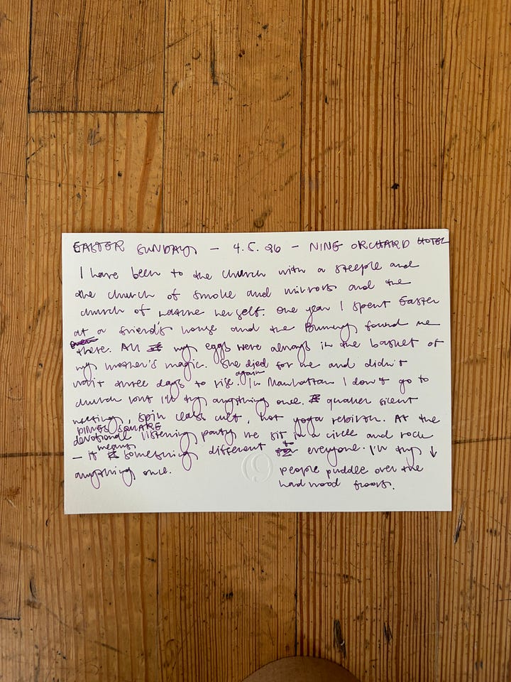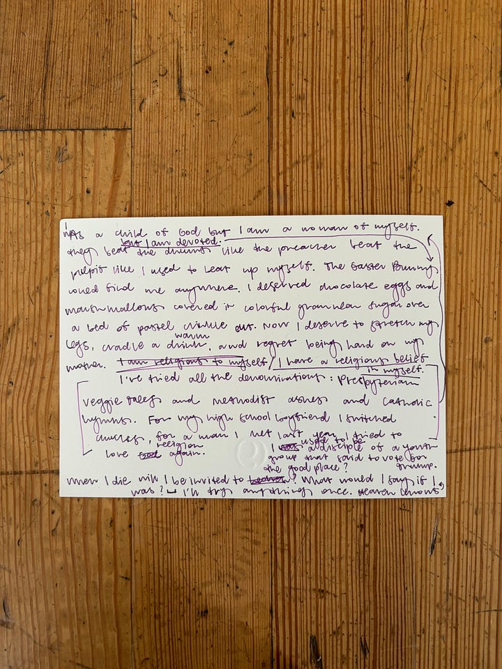 I have been to the church with a steeple and the church of smoke and mirrors and the church of nature herself. One year I spent Easter at a friend’s house and the Bunny found me there anyway. All my eggs were always in the basket of my mother’s magic. She died for me and didn’t wait three days to rise again. In Manhattan I don’t go to church but I’ll try anything once. Quaker silent meeting, spin class cult, hot yoga rebirth. Today at the Dimes Square “Devotional Listening” party we sit in a circle and rock back and forth, people puddling over the scuffed hardwood floors. It means something different to everyone. I’ll try anything once. I’ve tried all the denominations: Presbyterian Veggie Tales and Methodist ashes and Catholic hymns. For my high school boyfriend I switched churches, for a man I met last year I tried to love religion again. I was a child of God but I am a woman of myself. They beat the drums like the preacher beat the pulpit like I used to beat up myself. The Easter Bunny could find me anywhere. I deserved chocolate eggs and marshmallows covered in colored granular sugar over a bed of pastel crinkle cut. Now I deserve to stretch my legs, cradle a warm drink, and regret being hard on my mother. But I am devoted. I have a religious belief in myself. When I die will I be invited to the good place? What would I say if I was? Heaven knows I’ll try anything once.